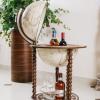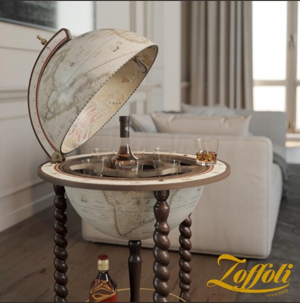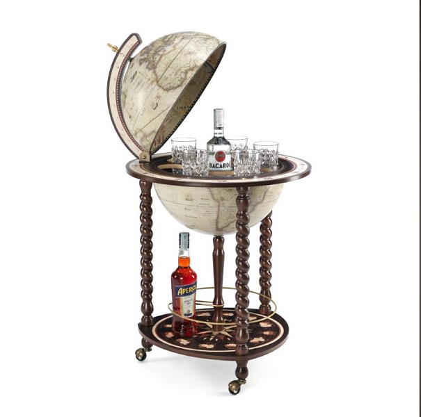Ножки сделаны из дерева, что делает его крепким и устойчивым при перемещении и полной загрузке бара. Глобус покрыт ламинированой бумагой с изображением карты Мира 16 века. Внутрення часть сферы глобус-бара разделена на 3 отсека для бутылок (3-4 штуки) и бокалов. Устойчивые колесики с поворотом на 360 градусов легко перемещаются по полу и ковровому покрытию.При правильном уходе глобус-бар прослужит долгие годы и станет фамильной ценностью и особой гордостью своих хозяев.