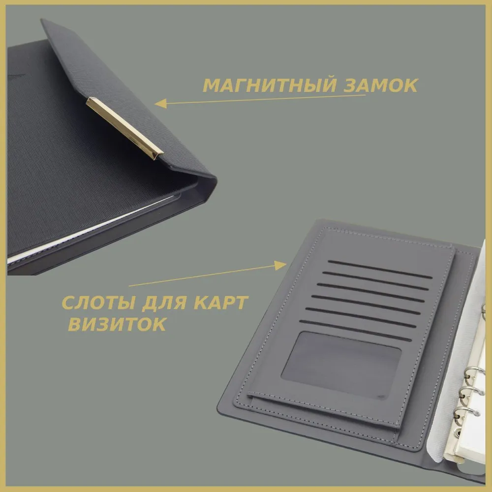 Набор подарочный ежедневник + ручка роллер представляет собой идеальный подарок для любителей организованной жизни и работы. Этот ежедневник выполнен в стильном дизайне, имеет тиснение, который отражает стремление к порядку и эффективности. Ежедневник имеет магнитный замок, удобное крепление листов- разъемный кольцевой механизм для стандартных бумажных блоков формата А5, что позволяет при необходимости произвести смену блока или увеличить количество листов. В комплект входит ручка роллер, которая добавляет особый шарм и практичность набору. Ручка выполнена из качественных материалов, что обеспечивает ее долговечность и комфорт при использовании. В набор входит также ручка, которая изготовлена из металла и пластика, корпус покрыт лаком. Нанесена лазерная гравировка в виде надписи и эмблемы. Ручка роллер подарочная с чернилами синего цвета, стержень сменный, толщина 0.7 мм.